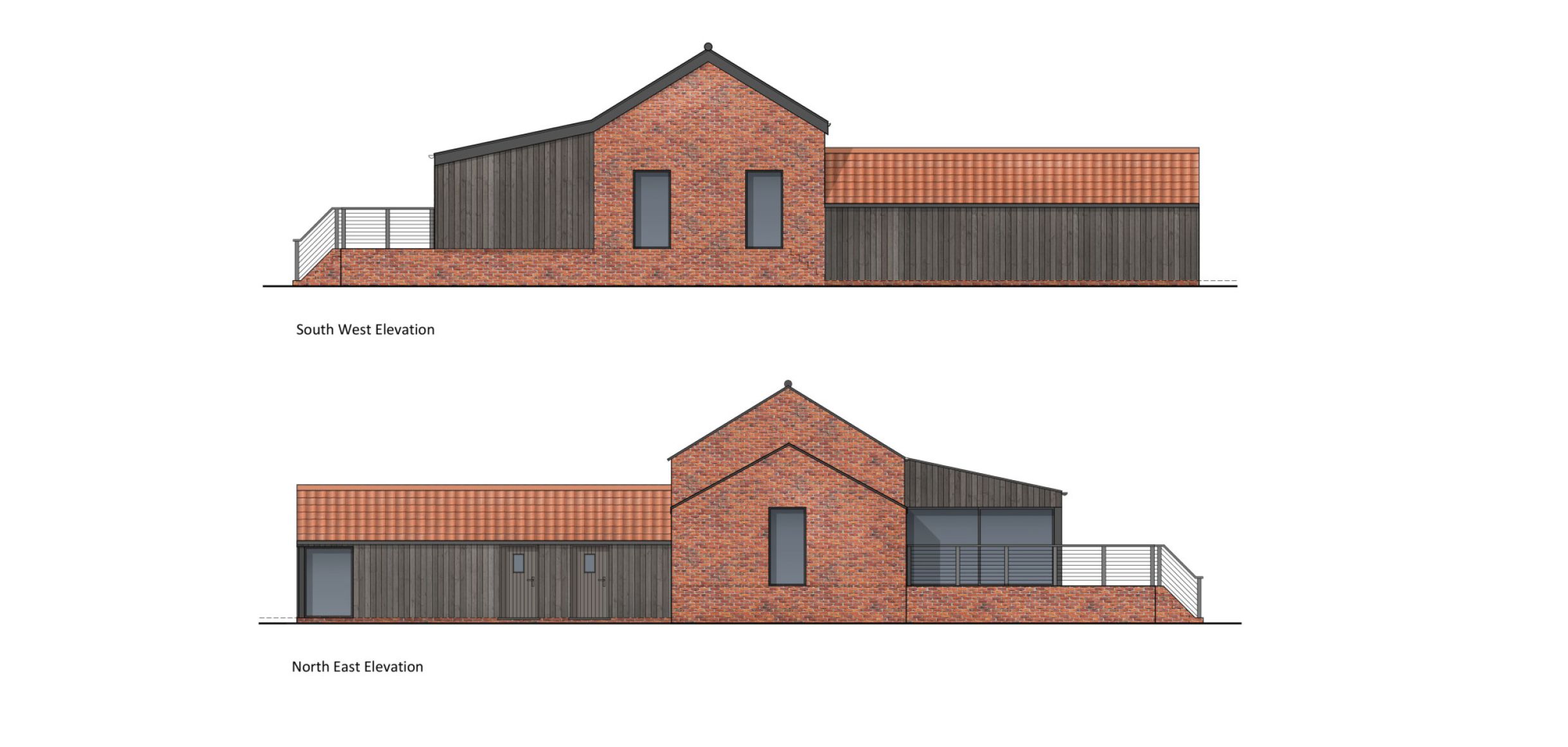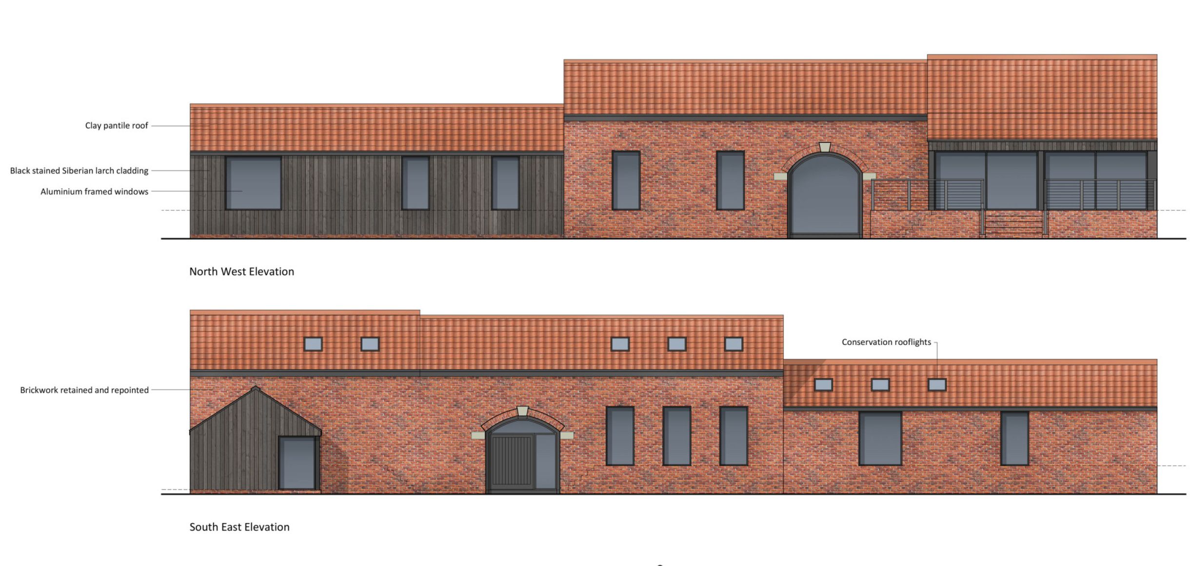 Architecturally, the scheme adopted a restrained and respectful design language to celebrate the existing character. The original brickwork was retained and repointed, roofs were re-clad in traditional clay pantiles, and new elements were expressed using dark-stained Siberian larch cladding and contemporary aluminium-framed glazing. This approach ensured a clear distinction between old and new, while delivering a cohesive and characterful whole.