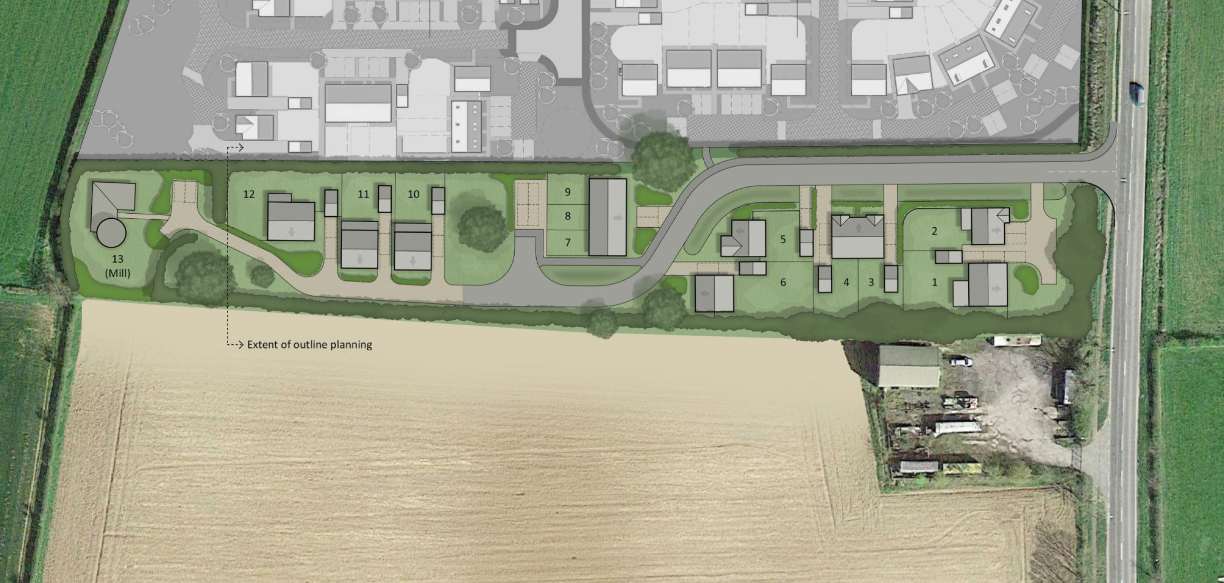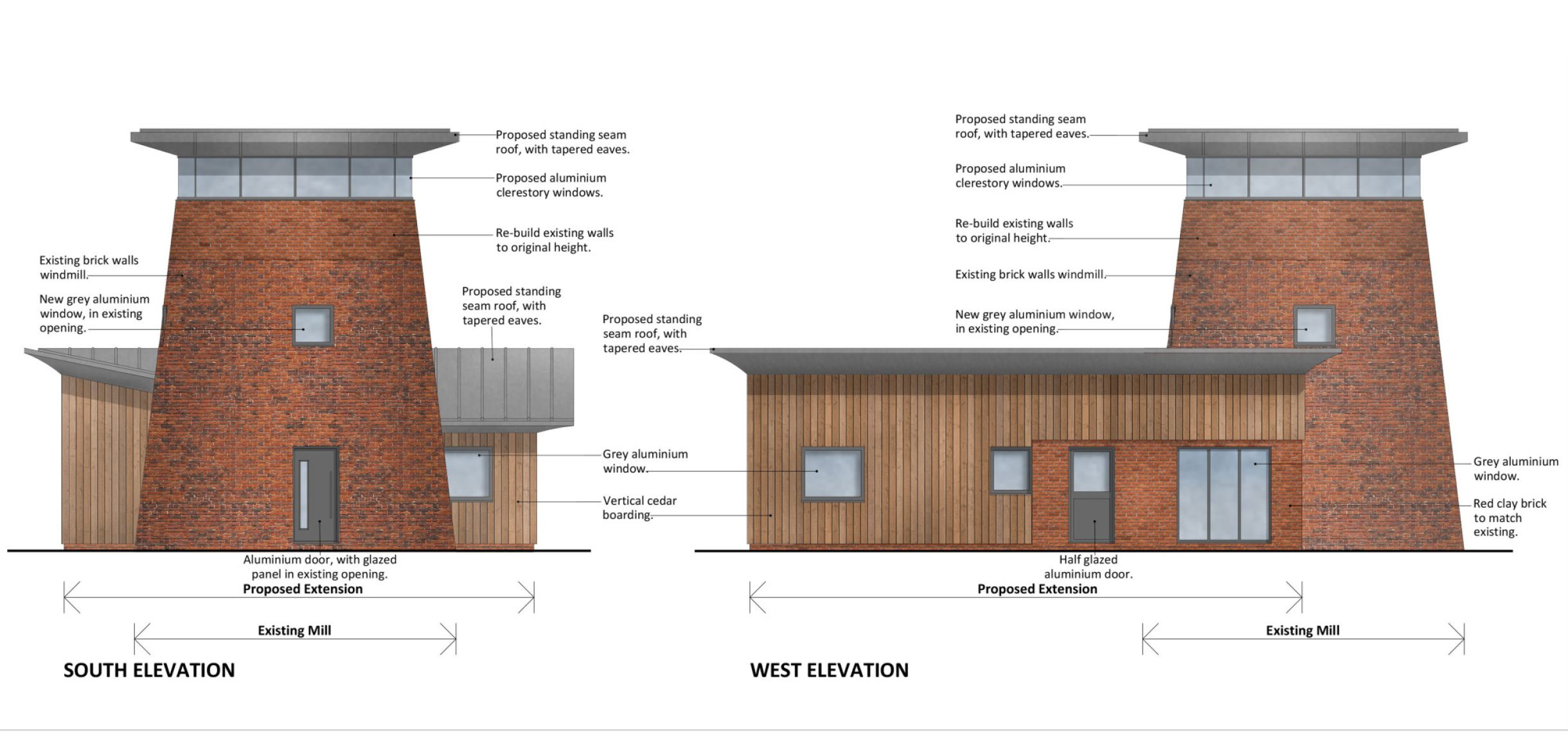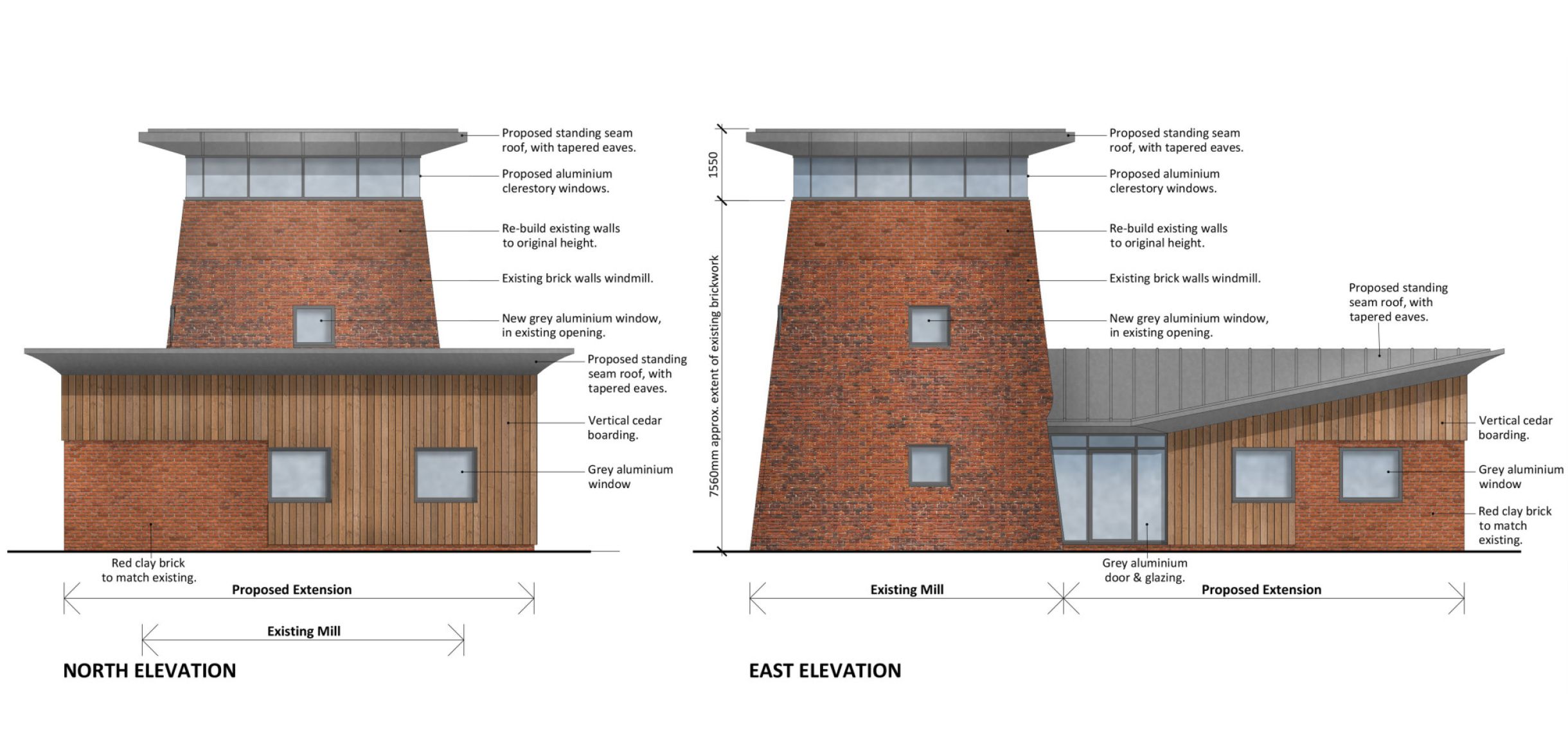 As part of an outline planning application for the surrounding land, a proposal was developed to retain and convert the mill into a unique three-bedroom home. The scheme included a carefully designed single-storey extension to the rear, with principal living spaces positioned at ground floor level to maximise accessibility and connection with the surrounding views.